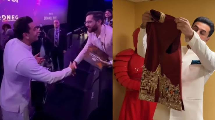 जैकेट पर बुनी श्रीराम-अयोध्या मंदिर की तस्वीर, रणबीर कपूर को फैन ने दिया खास गिफ्ट — रामायण टीजर लॉन्च पर