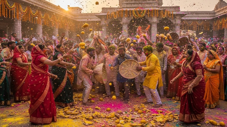 मथुरा-वृंदावन में फूलों और लड्डुओं की होली: एक-दूसरे पर जमकर बरसाए जाते हैं लड्डू और फूल!