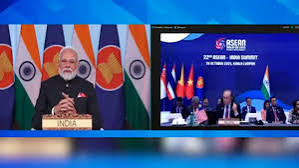 अनिश्चितता भरे वैश्विक दौर में भारत-आसियान साझेदारी को मजबूत बनाने का संकल्प लेते हुए प्रधानमंत्री नरेंद्र मोदी ने शनिवार को 21वें आसियान-भारत शिखर सम्मेलन को वीडियो कॉन्फ्रेंसिंग के माध्यम से संबोधित किया। “हम साझा मूल्यों की डोर से बंधे हुए हैं…” – इस भावुक उद्गार के साथ पीएम मोदी ने आसियान नेताओं के बीच गहरी एकजुटता का संदेश दिया, जो इंडो-पैसिफिक क्षेत्र की स्थिरता और समृद्धि का आधार बनेगा।