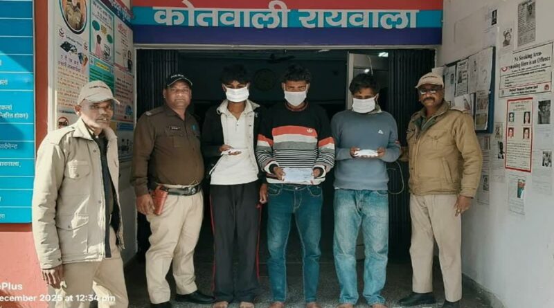 जानकारी के अनुसार रायवाला कोतवाली क्षेत्र में देर रात को पुलिस टीम चेकिंग कर रही थी. उसी दौरान पुलिस ने तीन अलग-अलग जगहों से तीन नशा तस्करों को गिरफ्तार किया है. पुलिस की गिरफ्त में आए आरोपियों का नाम फुजैल पुत्र जिशान, वसीम आदिल और अजय उर्फ मोनू पुत्र शमशेर है.