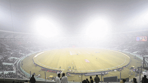 कोहरा इतना घना है कि स्टेडियम में एक छोर से दूसरा छोर दिखना मुश्किल हो रहा है। दर्शक ऊपरी स्टैंड से विपरीत छोर की सीटें तक नहीं देख पा रहे। अंपायरों ने कई बार मैदान का मुआयना किया, लेकिन विजिबिलिटी खराब होने से खेल शुरू नहीं हो सका। कमेंटेटरों का कहना है कि शाम ढलने के साथ कोहरा और घना हो सकता है, जिससे मैच की संभावना कम होती जा रही है।