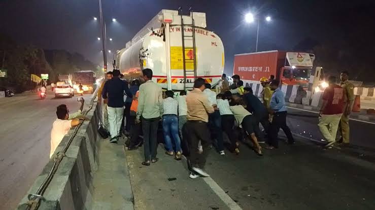 टक्कर इतनी तेज थी कि टैंकर क्षतिग्रस्त हो गया और उसकी टंकी फटने/टूटने से पेट्रोल सड़क पर बहने लगा।