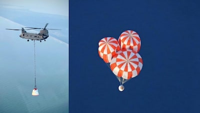 आसमानी रंगोली: मॉड्यूल के नीचे गिरते समय एक विशेष क्रम में 10 पैराशूट खुले, जिन्होंने हवा में एक ‘आसमानी रंगोली’ जैसा दृश्य बना दिया। इन पैराशूटों ने गिरते हुए कैप्सूल की गति को नियंत्रित किया और उसे सुरक्षित रूप से पानी में उतारा।