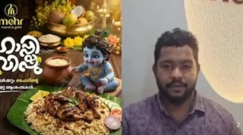 अलाप्पुझा (चेर्थला): केरल के चेर्थला में ‘विशु’ त्योहार के अवसर पर एक विवादित विज्ञापन साझा करने के आरोप में पुलिस ने एक रेस्टोरेंट मालिक को गिरफ्तार किया है। आरोप है कि रेस्टोरेंट के प्रचार के लिए भगवान कृष्ण के एक अपमानजनक चित्रण का उपयोग किया गया, जिससे धार्मिक भावनाएं आहत हुई हैं।